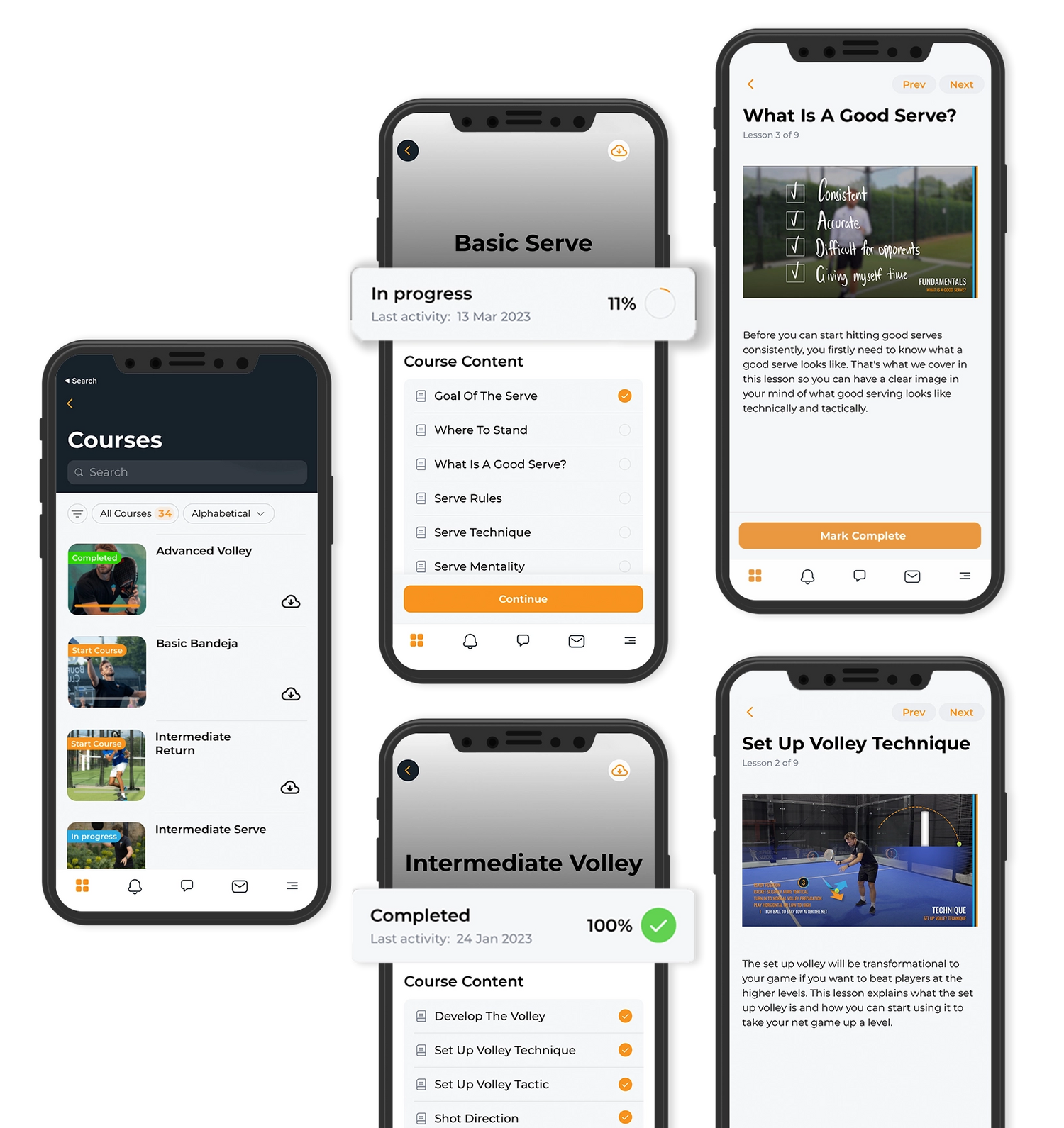 Our online padel coaching platform has hundreds of on-demand lessons, training roadmaps and personalised feedback from the coaching team, plus a global community of like-minded padel players.